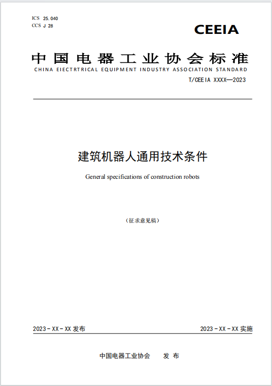 团体标准《建筑机器人通用技术条件》(计划编号为:CEEIA2023027),由中电协电气场所用机器人安全与检测标准化专业委员会提出,由中国电器工业协会标准化工作委员会归口。