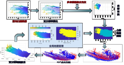全局三维真彩点云环境建模在软件和硬件的基础上搭建交互平台,通过人机操作界面收集相机图像以及中控通信模块的点云数据、位姿信息,并且能利用点云数据对图像进行拼接处理得到合成图像,从而获取三维真彩点云图。